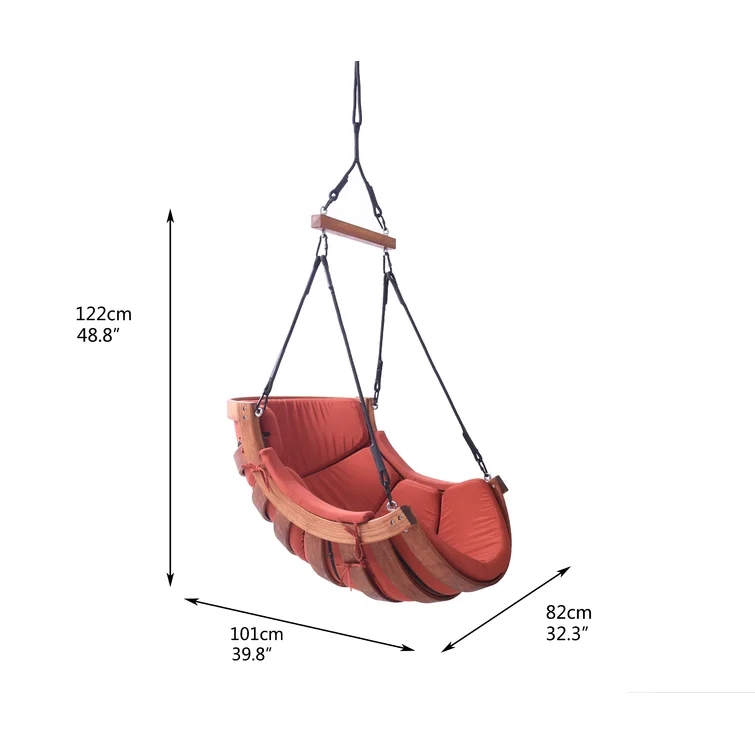 DescriptionFun and indulgent, this wooden outdoor hanging chair is a charming addition to a patio, porch, or balcony. It features a sturdy and durable steam-bent wood frame inspired by a classic lobster tail shape that cradles the body for ultimate comfort as you enjoy summer shade or a bit of warm spring sunshine. Its thick, ultra-plush foam cushion is wrapped in polyester fabric in a soft red as this hanging outdoor chair sways in the breeze to rock you into soothing relaxation.